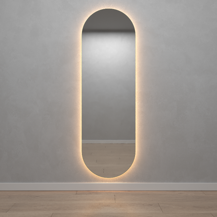 Безрамное зеркало овальной (капсульной) формы с контурной (тыльной) тёплой подсветкой, свет 3000К. Подложка из высококачественного МДФ, светодиодная лента защищена матовым свето-рассеивателем от попадания пыли и влаги. Есть вывод 220W для подключения к сети, включение подсветки от выключателя на стене, либо от розетки. Возможно установить сенсорную кнопку на заказ в любом месте зеркала.